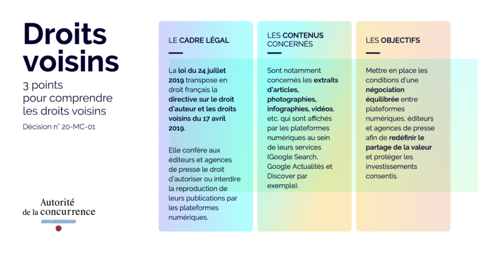 Here is the request as summarized on the organization’s website: Seizure in November 2019 by several unions representing press publishers (Syndicate of Editors of the Press Magazine, the Alliance of General Information Press) as well as by the Agence France-Presse (AFP) of practices implemented by Google on the occasion of the entry into force of the law of 24 July 2019 on neighboring rights, the Competition Authority is today ordering emergency measures in the part of the procedure of provisional measures. The Authority considered that Google’s practices on the occasion of the entry into force of the law on neighboring rights were likely to constitute an abuse of a dominant position, and would seriously and immediately damage the press sector.